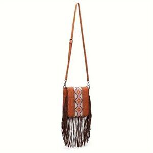 Vintage Bohemian Style Rivet Crossbody Bag, Tassel Aztec Tribal Fringe Purse