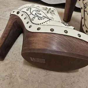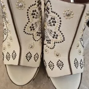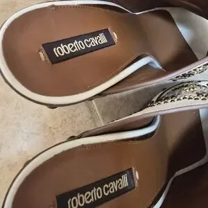 Step out in style with these Roberto Cavalli cream heels. Featuring intricate embellishments, these shoes add a touch of elegance to any outfit.