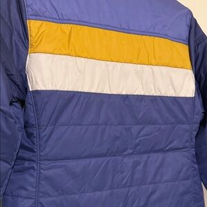 Vibrant puffer jacket by L.L. Bean. Features bold blue, yellow, and white colors. Ideal for keeping warm.