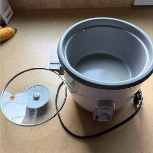 Zojirushi rice cooker in white can make up to 3 cups of rice. Features a clear lid and simple controls. Some scratches on the inner cooking pan.