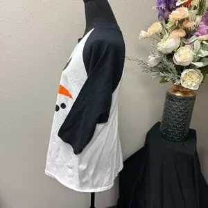 Festive black-and-white baseball tee featuring a bold snowman face graphic with carrot nose—perfect for holiday parties, winter events, and Christmas photo ops. Soft, comfy, and playful for the season.