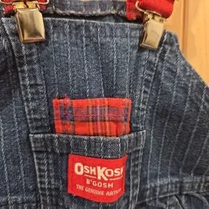These Rare Vintage Cheer Cats patch OshKosh B'gosh blue pinstripe denim overalls are perfect for your little one's adventures. With adorable red plaid lining, bubble style and cheer cats patches on back. Made with durable fabric, they offer comfort and style. Faint stain and wear to the suspenders, very good vintage condition.