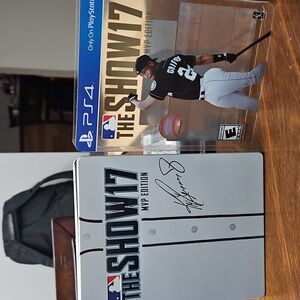 MLB The Show 17 - is the signature edition with a metal case and a plastic protection sleeve. This copy does not come with an instructions manual, but the disc is in Like New Condition