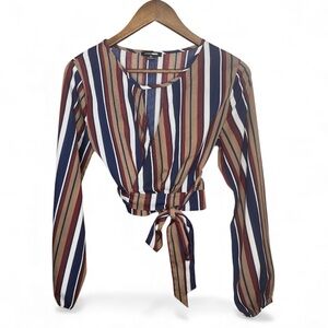 ❀ Fashion Nova “Put You In Line” crop top, featuring multicolor stripe pattern in navy blue, white, maroon/ rust hue with long sleeve and front opening that your tie. Very cute and flattering! Ties around the waist