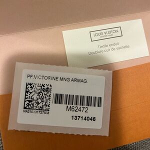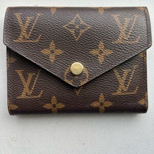 Victorine Wallet. Elegant card holder with classic monogram. Features brown leather and gold accents.