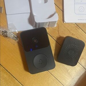 Smart video doorbell with USB cable and mounting accessories. Sleek black design.