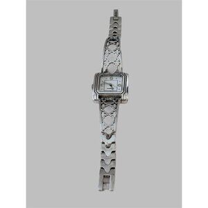 The product is a vintage Brighton Salamanca silver tone bracelet watch with a square case and Arabic numerals. It features a lacy look with a buckle closure and a quartz movement. The watch has a white dial with large numerals, seconds hand, and a 12-hour dial. The case is silver plated, and the band is a metal bracelet in silver tone. This classic timepiece is designed for women and has a case size of 27mm, making it a stylish and elegant accessory. Comes in a Brighton Tin excellent condition no tarnish. Has been gone over by my Jeweler.
