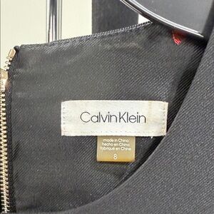 Chic high low dress by Calvin Klein. Features bold red floral pattern on black. Ideal for stylish events.