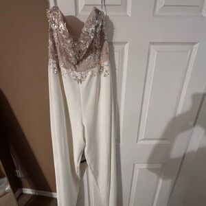 Chic strapless jumpsuit with a shimmering floral bodice and flattering white trouser pants. Stretchy and comfortable with internal plastic straps to hold the bodice up! Wore after my wedding to the after party, and it fit like a dream (and I’m not a strapless kind of girl)