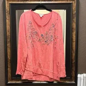 Chic coral top with floral embroidery. Soft fabric. Ideal for casual wear. 100% cotton. Gently worn