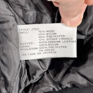 This is a Port Authority men's varsity-style jacket in size XL from the 2009 Blackie Gejeian's Fresno Autorama event. The jacket is constructed with a wool blend shell, 100% genuine leather sleeves, and a quilted polyester lining for insulation. It features embroidered graphics on the front celebrating the 50th Anniversary and a large "Fresno Autorama" graphic on the back. This piece has a full snap-button front closure and two front pockets. The style number visible on the interior tag is J783.