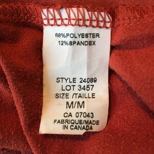 Mandy Evans Top Women's Size Medium. Polyester / spandex. Suede-feel to fabric. Burnt orange. Scalloped hem. Made in Canada. Pre-owned. No rips, holes or stains. See photos. Measurements in inches: *approximate* - Chest 21.5 (pit to pit) - Waist 18.5 (seam to seam) - Length 22.5 G1:20105