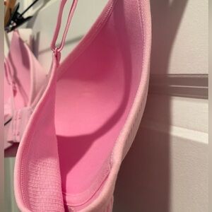 1. Light pink, ribbed, adjustable strap, lightly lined, no underwire, Hanes logo in black lettering.