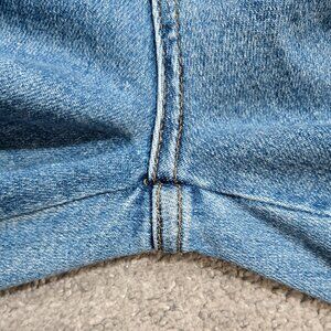 Good used condition, with no stains or tears. Medium wash ankle jeans, with frayed trims. Stretchy. Has the classic 5 pocket jean design, and a zip fly/button closure.