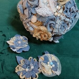 Rustic-style wedding bouquet and matching brooches/boutonnieres made from fabric, specifically denim and burlap, adorned with lace and pearl beads accent.