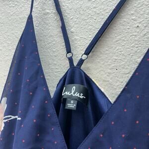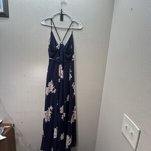 LULU'S Loiselle Navy Blue Floral Print Polka Dot Wrap Maxi Dress SZ S formal high low wedding guest special occasion