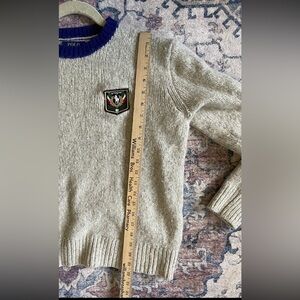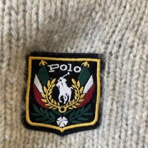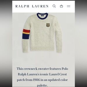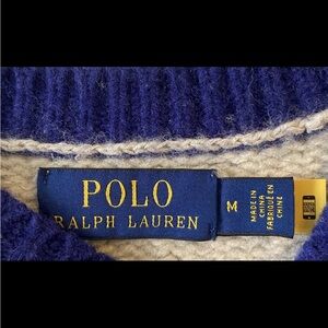 Classic crewneck sweater in grey/beige. Features blue collar and colorful sleeve detail. Iconic Polo Ralph Lauren logo on chest.