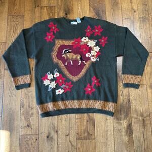 VTG Hand Embroidered Christmas Holiday Ramie Knit Sweater Poinsettia Deer Sz XL