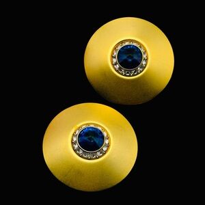 These classic vintage 1980’s disk clip earrings are proof disco is not dead! A whopping 2” across, the fabulous earrings are embellished with a large intense blue rivoli surrounded with a row of channel set rhinestones. The finish is absolutely gorgeous, a burnished matte gold tone. For all their size they are light weight and easy to wear. Shades of Dallas and Dynasty anyone???