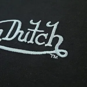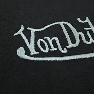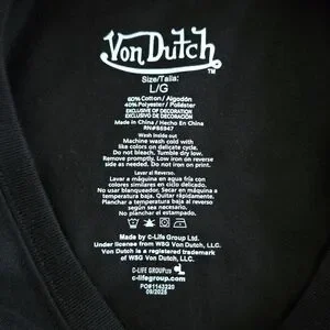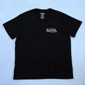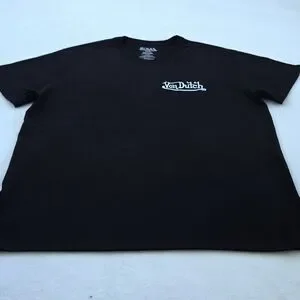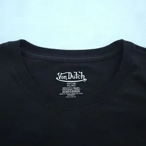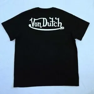 Color of tee👕 is black🖤 with a large Von Dutch logo in white on upper back and smaller version embroidered🪡 in white on front left chest