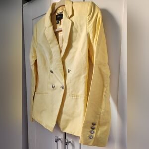 Stylish double-breasted blazer in butter yellow. Features silver buttons. Linen and cotton blend. Tag says Women's XS, fits more like a Women's Small. Mango brand. Fun jacket for work and the office. Excellent condition, just a little wrinkled so may need a little steam ironing.