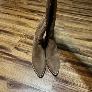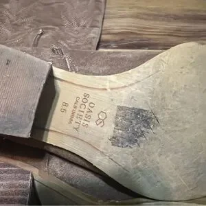 The Oasis Society boots are a stylish and trendy pair of women's shoes that feature a Western-inspired design. Made from beige suede, these boots have a unique and fashionable look that will elevate any outfit. With a US shoe size of 8.5, these boots are comfortable to wear and perfect for adding a touch of flair to your wardrobe. The Oasis Society boots are a must-have for any fashion-forward woman looking to make a statement with her footwear.
