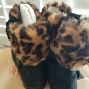 EUC G by GUESS ANKLE BOOTS. SUEDE UPPERS TRIMMED IN FAUX LEOPARD FUR.
