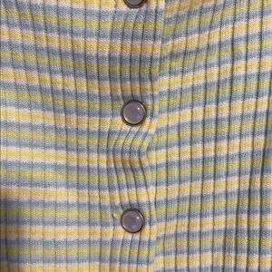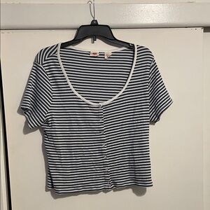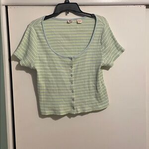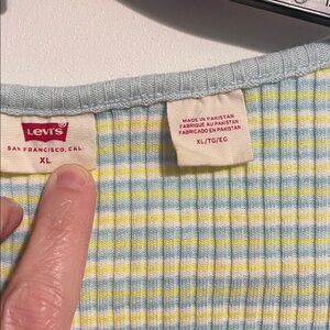 This stylish striped Levi cropped shirt is white, green blue and a light purple button-up top. I have two of them the other one is same style but a yellow color