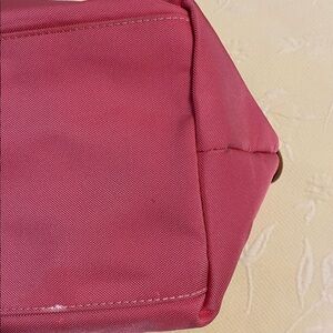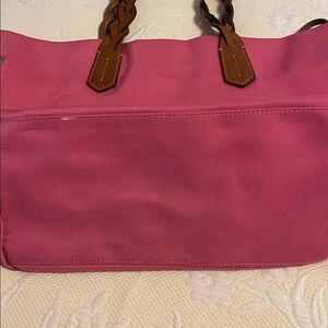 Stylish pink tote bag featuring elegant brown accents. Perfect for everyday use. Does have some normal wear. See pictures