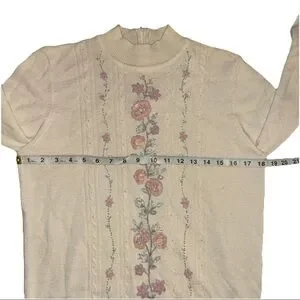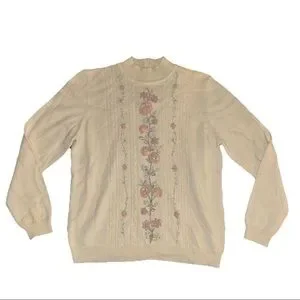 Vintage Alfred Dunner Sweater M Petite Cream Purple Floral Embroidered Grandma