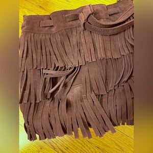 Stylish crossbody bucket bag with fringe detail. Rich burgundy suede. Perfect for adding flair to any outfit. It has a snap closure, one interior zip pocket and two interior side pockets.