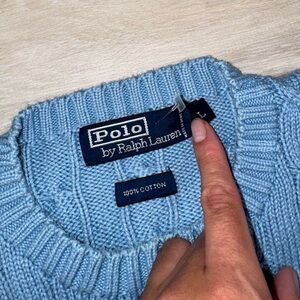 Elegant light blue cable knit design. Iconic Ralph Lauren style. Comfortable crewneck fit.