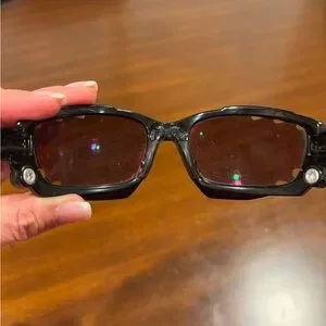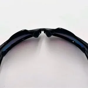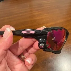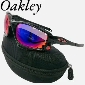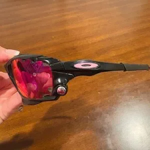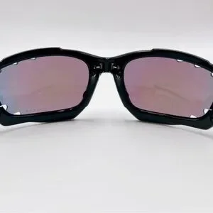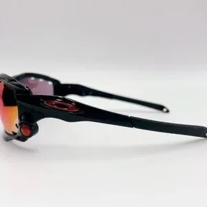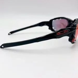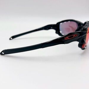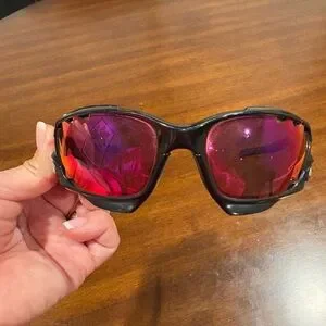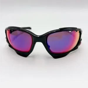 Oakley Racing Jacket sunglasses with black frames and red/violet mirrored lenses. The frame features Oakley's Switchlock technology for easy lens changing and Unobtainium components for a no-slip grip. The lenses are a Prizm sport variant, designed to enhance contrast and clarity for specific environments. Preloved in great condition.