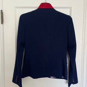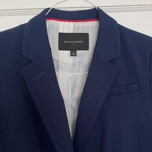 Well-tailored Banana Republic blue blazer with button and pocket detail. Fully lined. Red felt underlining to collar.