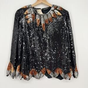 Vintage Royal Feeling Silk Sequin Evening Blouse Top NEW Small Black Silver Glam