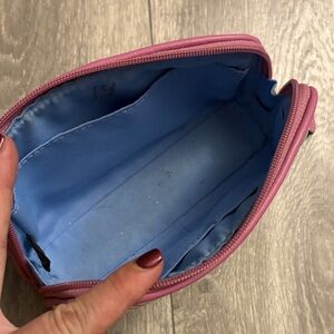 Chic Coach wristlet with vibrant signature print. Pink trim enhances its stylish look. Ideal for any occasion.