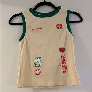 Stylish cream tank top with green trim. Features playful graphics and logo details. Perfect for casual wear.