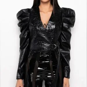 Chic black blazer with reptile textured design. Features dramatic puff sleeves. Perfect for a bold statement. See photo #3 for a slight discoloration on the part top of the sleeve. She’s been worn once.