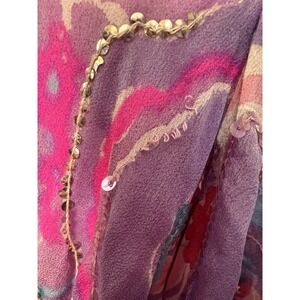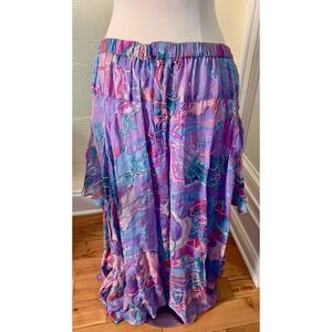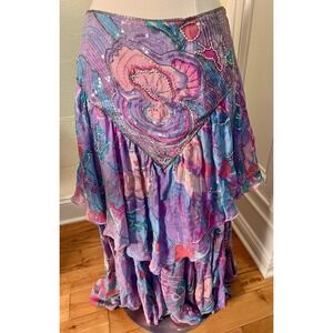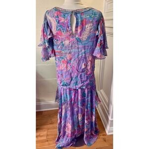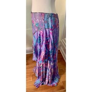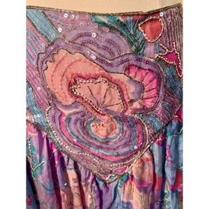 This vintage 80s Judith Ann Creations butterfly skirt and blouse set is a stunning piece made of 100% silk with sequin accents. The floral pattern and multicolor design make it perfect for various occasions such as weddings, parties, or formal events. The long dress length, scoop neckline, and short sleeves give it a classic and elegant look, while the beaded details add a touch of bohemian and colorful flair. Made in India, this lined dress features a drop waist and is ideal for all seasons, embodying a blend of art, flower, butterfly, and glam themes from the 80s and 90s.