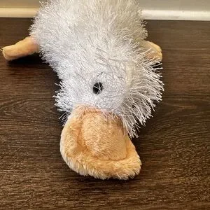 Soft and fluffy plush duck toy in white and tan. Perfect for cuddling.