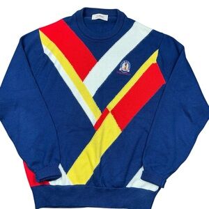 Vintage 80s/90s Spring house Opryland Hotel knit golf sweater. Made in Scotland. Cobalt blue/yellow/red/white. Stitched logo. High-quality. Tagged as a medium. 22 inches to pit, 27 inches warm. No rips or tears. Smoke and pet free home.