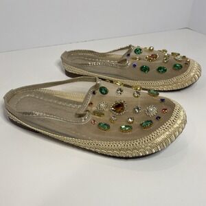 Beautiful pair of women's embellished khussa / jutti style flats featuring a gold mesh upper decorated with multicolor imitation gemstones, pearls, and beads. These slip-ons have a traditional woven edge and a flat sole marked 230 (fits approx. US Women's 6).