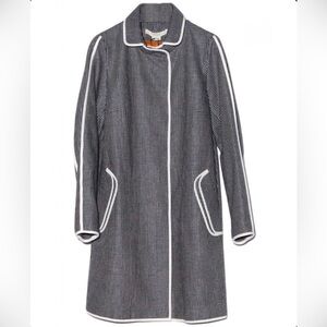 Solid piping outlines the loose-cut silhouette, and a back vent allows for easy movement. Hidden snaps close the placket, and pockets sit at the hips.