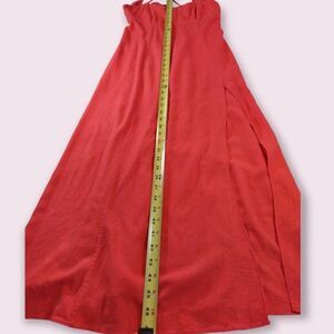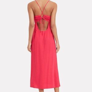 The Josephine dress in bright coral linen is our spin on the classic summer sundress. Empire waist. Crossed back straps with a drawstring cut-out. High slit detail in front. Side zip closure. Unlined. In coral. Fabric: 70% Cotton, 30% Linen Size 0 Chest: 17”