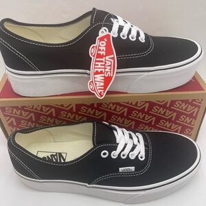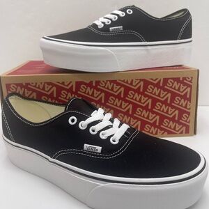 Elevate your style with these Vans platform sneakers. Sleek black canvas with white accents. Perfect for casual wear.