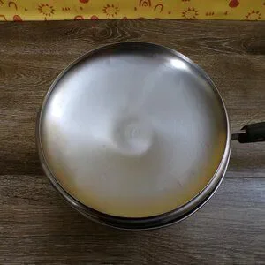 Saucepan is in good condition, clean, has typical markings from cleaning/use, slight wobble, small dings around bottom edge.