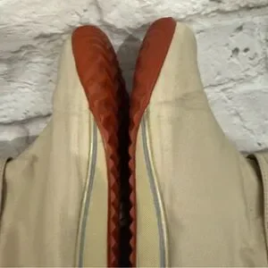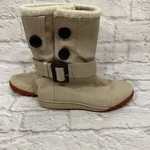 The Sorel Milano Breve is a women's mid-calf boot in size 5.5 featuring a beige waterproof fabric upper and a cozy interior lining. Designed for winter, it has a closed toe and rubber outsole, with button and buckle accents for closure. Suitable for casual occasions, this boot is perfect for keeping warm and dry. The condition is pre-owned but very good