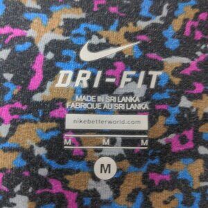 Nike Women's Dri Fit Cropped Leggings in size Medium with a geometric pattern in blue, black, and purple.