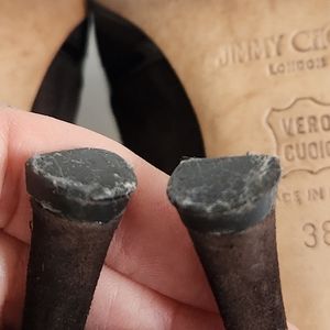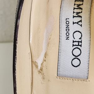 Pre-owned Authentic Jimmy Choo Brown Suede and Patent Leather Heels, signs of wear on the Pointed Toe as you can see at picture. it has Scratch on one of the insole, Made in Italy
