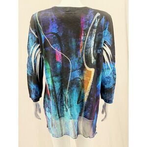 Jess & Jane Top Womens Large Blue Abstract Tunic Sheer Boho Art to Wear Stretch Colorful